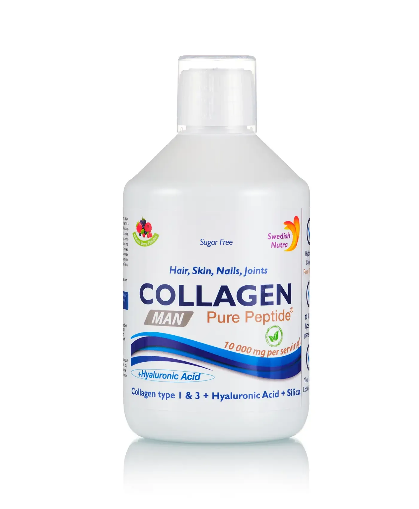 Complex Special pentru Bărbați. Colagen Lichid Hidrolizat Tip 1 și 3 cu 10 000 Mg la Doza Zilnică + Acid Hialuronic + Vitamina E + Cupru + Siliciu + Biotină + Vitamina C, B6, B12. Produs Original Fabricat in Suedia ambalat în sticle ecologice cu 500 ml. O sticlă ajunge pentru 20 zile de administrare. Aromă deliciosă de Fructe de Pădure 100% Naturală!