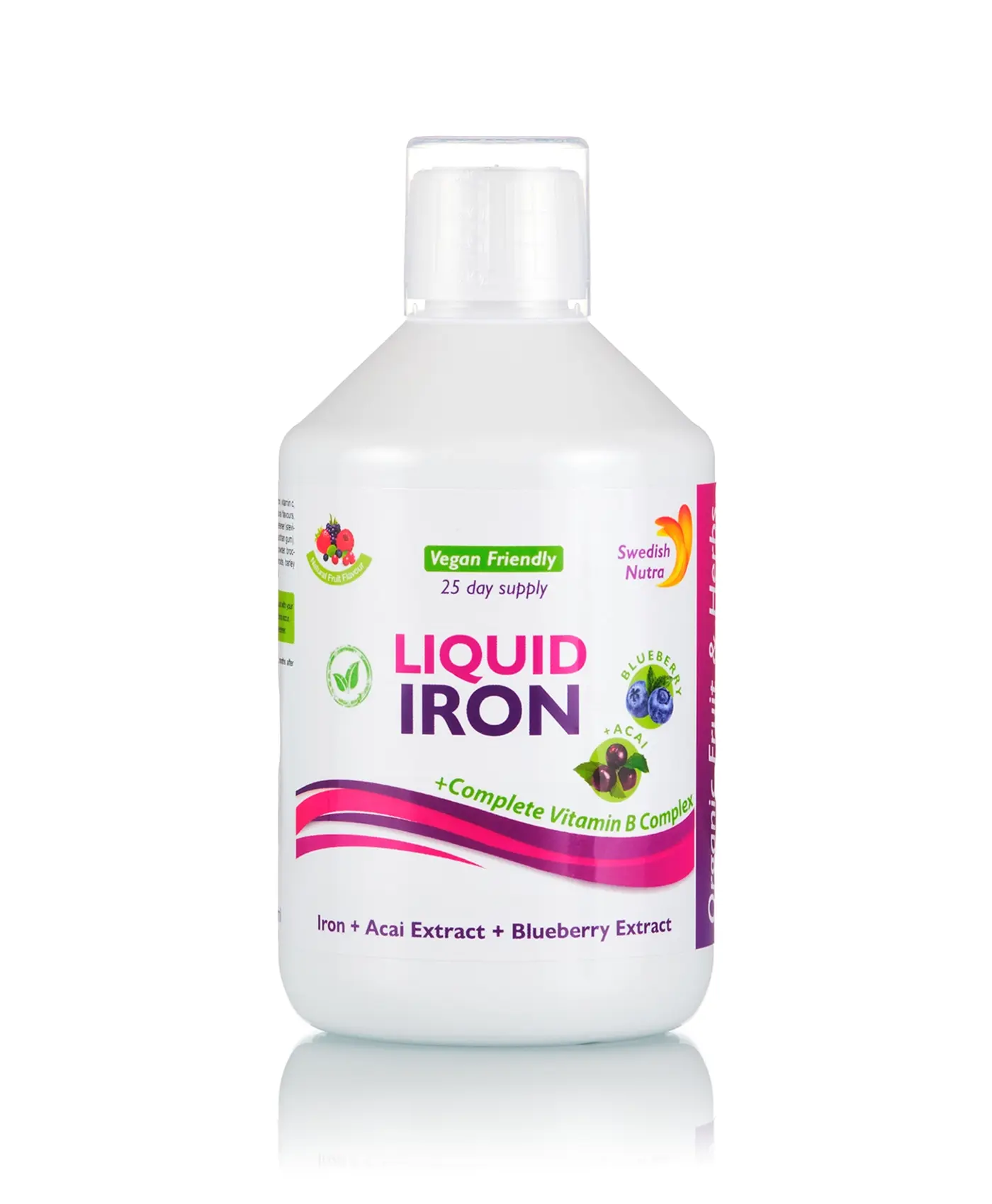 Supliment Nutritiv sub formă lichidă cu Absorbție foarte Ridicată și 15 Ingrediente Active: Fier, Vitamina C, Vitaminele B1, B2, B6, B9, B12, extracte din Acai, Afine, Broccoli, Aloe Vera, Alfalfa, Bioflavonoide din Citrice, Orz și Turmeric. Consolidează organismul, Reduce Oboseala și Epuizarea, Combate Anemia și Sprijină Sistemul Nervos Central. Fabricat în Suedia la cele mai Înalte Standarde GMP. Gust Delicios de Fructe de Pădure! O sticlă ajunge pentru 25 zile de administrare