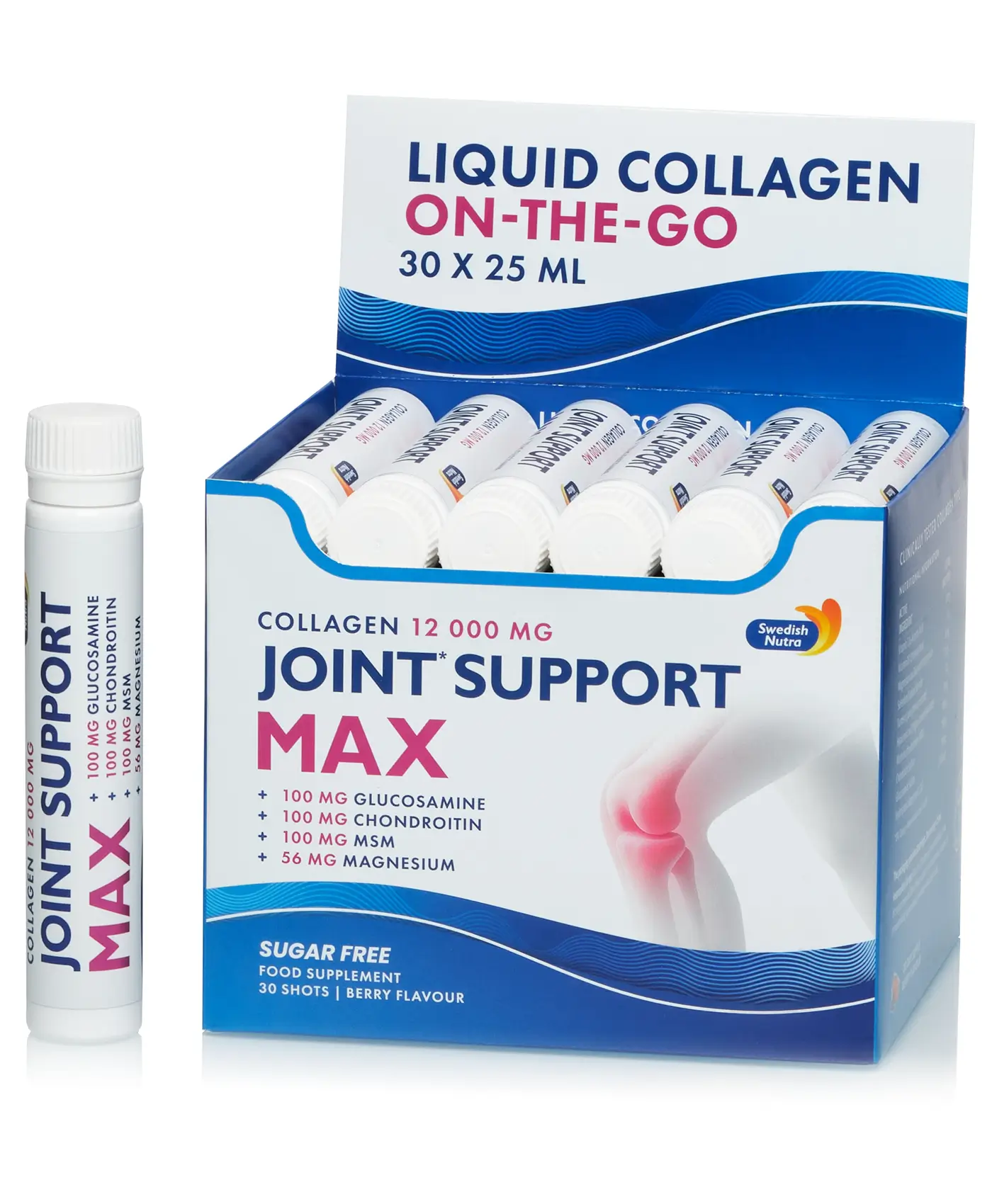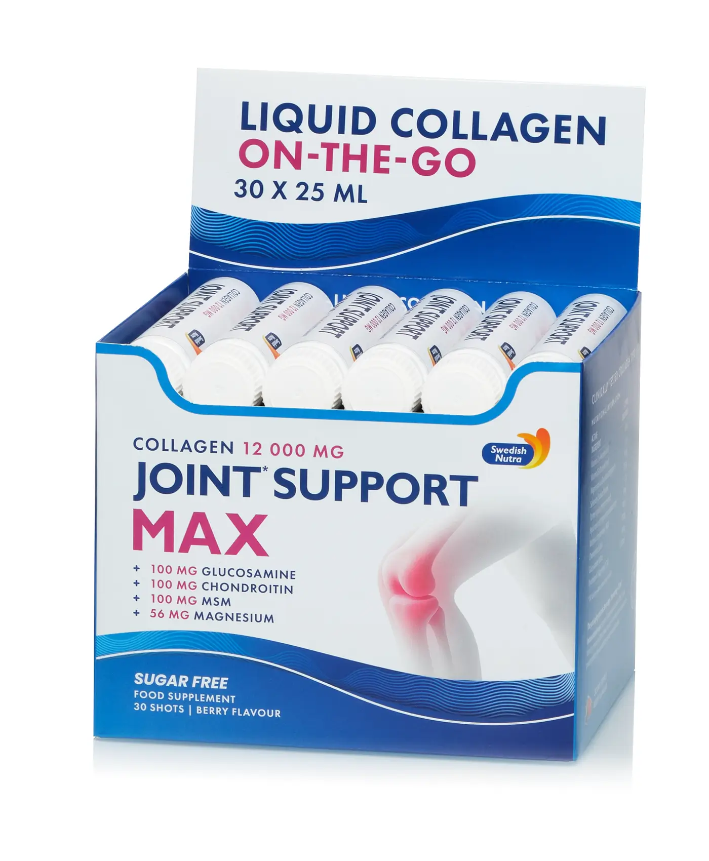 Joint Support Max Shots din gama Swedish Nutra este un produs revolutionar cu o concentratie mare de Colagen - 12.000 mg la doza zilnica. Formula contine 3 Tipuri de Colagen Tip 1, 2 si 3 si este imbogatit cu Acid Hialuronic, Glucoazmina, Condroitina, Turmeric, Seleniu si Vitaminele C si D care, prin actiunea lor complementara, poate fi folosit cu succes pentru toate tipurile de dureri articulare, dar si pentru refacerea mobilitatii si a sanatatii oaselor. Produs fabricat in Suedia la cele mai Inalte Standarde de Calitate.