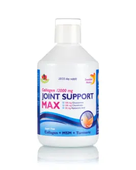 Joint Support Max este cel mai nou produs de Colagen pentru Articulatii din gama Swedish Nutra, cu cea mai mare concentratie de Colagen existent pe piata la ora actuala, 12.000 mg. Are in compozitie 3 tipuri de Colagen, Tip 1 , 2 si 3. Fiind o formula avansata, Joint MAX poate fii folosit cu succes si pentru toate tipurile de dureri articulare dar si pentru afectiunile articulare de grad avansat: artrita, artroza, gonartroza, cartilagii, ligamente, tendoane si alte tipuri de dureri: genunchi, cot, spate, gat, etc. Este eficient si la refacerea mobilitatii. Contine o formula imbogatita cu Acid Hialuronic molecular, MSM, Glucozamina, Condroitina, Turmeric, Vitamina C, Vitamina D si Seleniu.