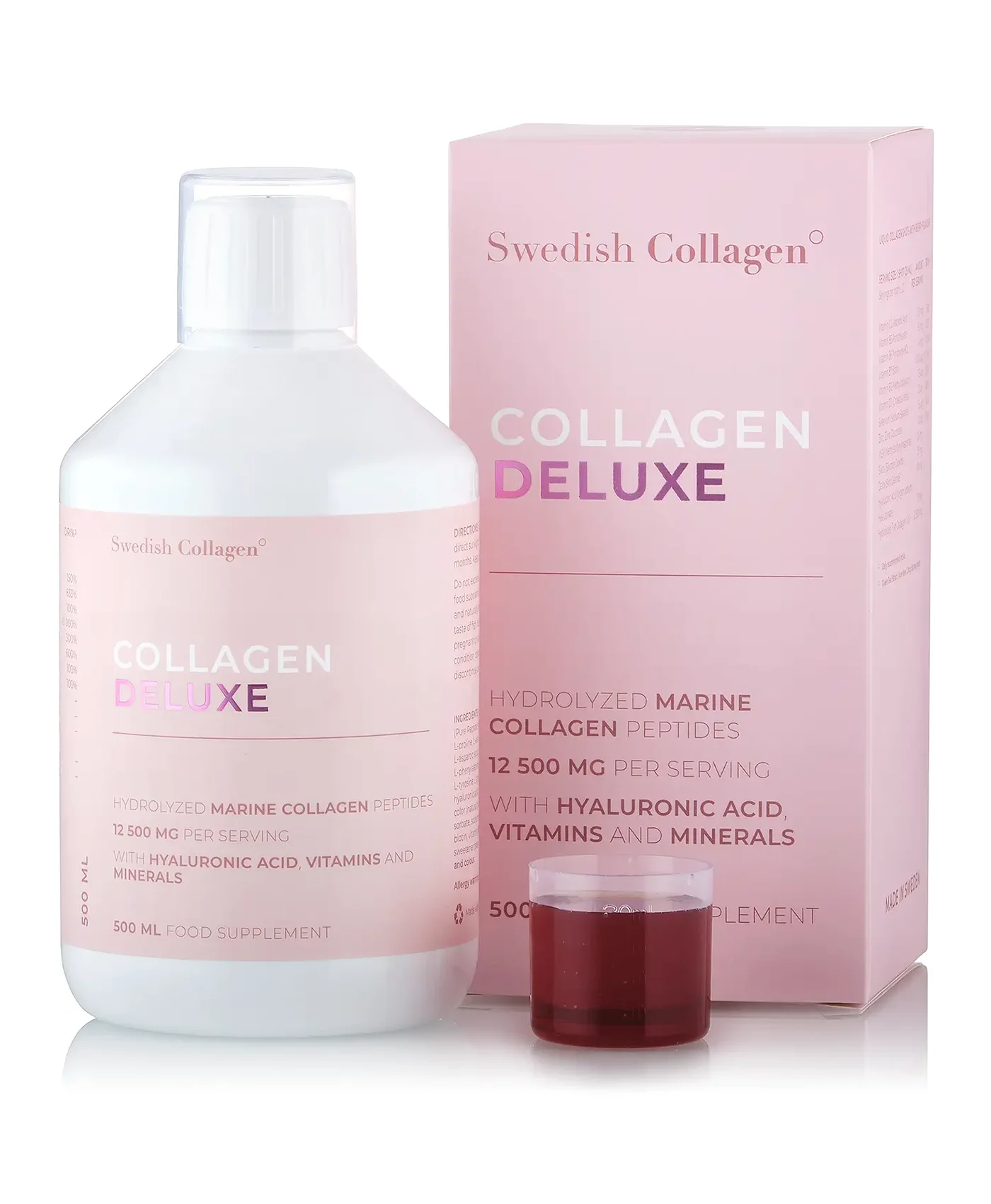 - Colagen Deluxe – Colagen Marin Hidrolizat Lichid cu 12.500 mg + Acid Hialuronic 75 mg + Biotină 5000 mcg + MSM 125 mg + Zinc + Siliciu + Vitamine – Sticlă cu 500 ml