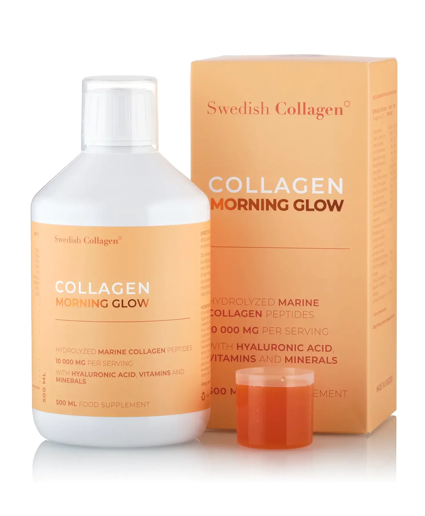- Colagen Morning Glow (din Peste) – Lichid, Hidrolizat Tip 1 si 3 cu 10.000 mg + Acid Hialuronic 25 mg + Retinol 800 mcg + Biotina 5000 mcg + Probiotice + MSM + Siliciu + Vitamine – 500 ml