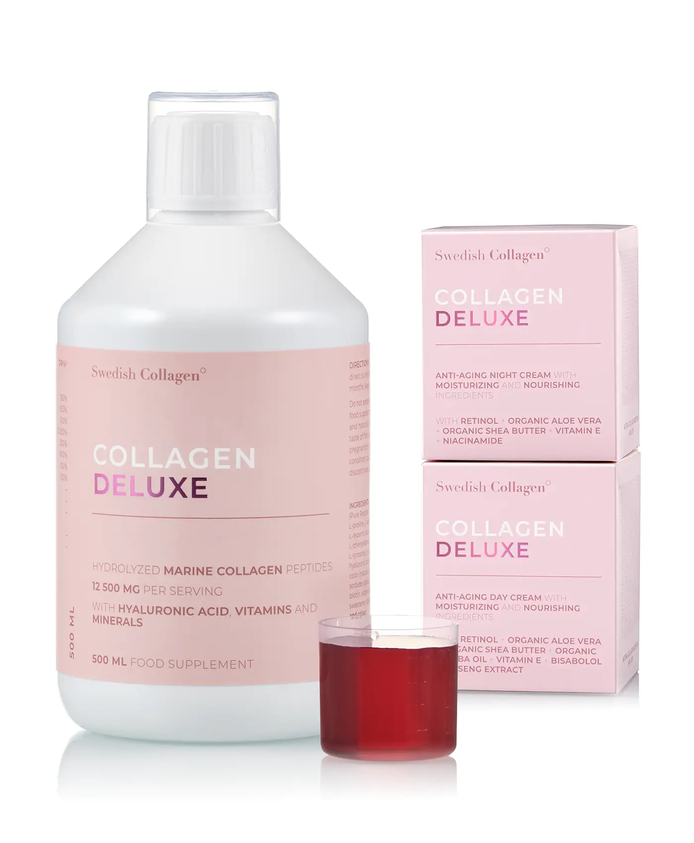 Setul "Deluxe Radiance" este perfect pentru oricine dorește să își îmbunătățească rutina de îngrijire a pielii cu soluții puternice împotriva îmbătrânirii. Ideal pentru persoanele cu piele matură sau obosită, acest set combină beneficiile intensive ale colagenului Deluxe lichid cu colagenul din cremele Deluxe pentru zi și noapte. Recomandat persoanelor care doresc să îmbunătățească textura pielii, să sporească elasticitatea și să obțină o strălucire tânără și radiantă. Experimentează totul în rejuvenarea pielii și descoperă-ți cel mai bun ten!